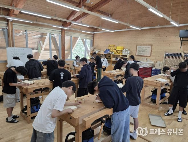 프레스유니온 강찬희 기자 | 상주시 성주봉자연휴양림의 상주목재문화체험장과 힐링센터에서는 지난 4월 27일 안동경덕중학교 학생들 150여명을 대상으로 목재문화체험장과 힐링센터에서 독서대 만들기 체험과 숲 해설 체험을 진행했다.