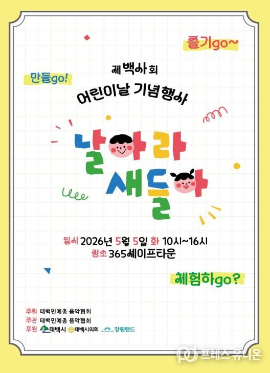 프레스유니온 강찬희 기자 | 태백시는 제104회 어린이날을 맞아 ‘날아라 새들아 페스티벌–만들GO·즐기GO·체험하GO’를 오는 5월 5일 365세이프타운에서 개최한다고 밝혔다.