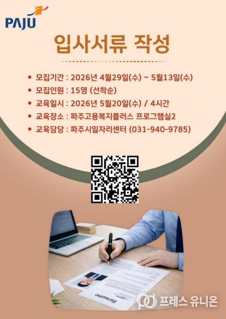 프레스유니온 김성길 기자 | 파주시는 중장년 구직자의 원활한 노동시장 재진입을 돕기 위해 ‘입사서류 작성 실습 교육’참여자 15명을 모집한다.