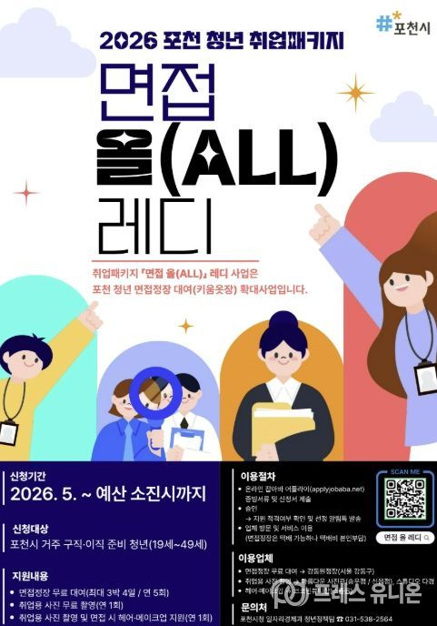 프레스유니온 김성길 기자 | 포천시는 구직 및 이직을 준비하는 청년들의 취업 준비 부담을 낮추고 취업 경쟁력을 높이기 위해 오는 5월 2일부터 2026 포천 청년 취업패키지 ‘면접 올(ALL) 레디’ 사업을 운영한다.