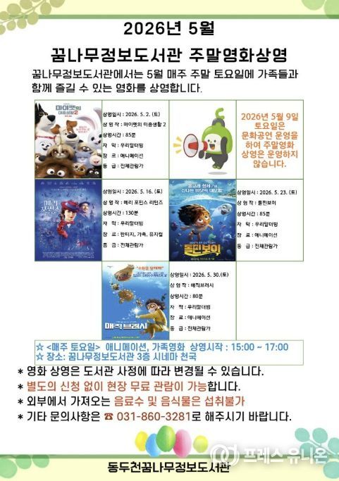 프레스유니온 김성길 기자 | 동두천시 도서문화사업소 정보도서관에서는 오는 5월 매주 토요일 어린이와 가족을 위한 애니매이션 및 가족영화 4편을 상영한다고 밝혔다.