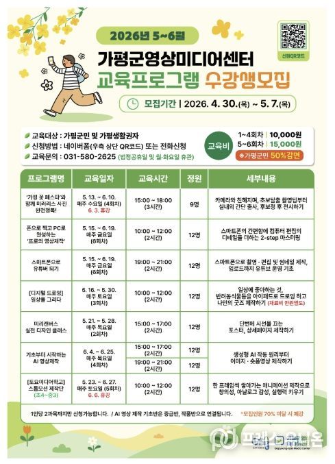 프레스유니온 김성길 기자 | 가평군영상미디어센터가 군민들의 영상 미디어 콘텐츠 역량 강화를 위해 ‘5~6월 미디어 교육 프로그램’ 수강생을 4월 30일부터 선착순으로 모집한다.