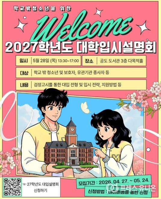 프레스유니온 김성길 기자 | 안성시학교밖청소년지원센터는 학교 밖 청소년의 성공적인 진학을 돕기 위해 오는 5월 28일 오후 1시 30분부터 공도 도서관 다목적홀에서 ‘2027학년도 대학 입시 설명회’를 개최한다고 밝혔다.