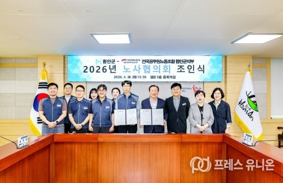 프레스유니온 강찬희 기자 | 함안군은 지난 28일 군청 3층 중회의실에서 전국공무원노동조합 함안군지부(지부장 조주환)와 공무원 권익 향상과 복지 증진을 위한 노사협의회 합의서에 최종 서명했다고 밝혔다.