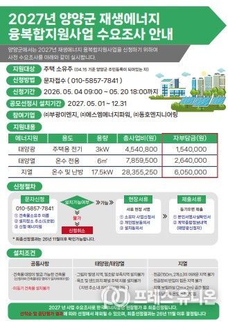 프레스유니온 강찬희 기자 | 양양군이 에너지 비용 절감과 온실가스 감축을 위한 ‘2027년 신재생에너지 융복합지원사업’ 공모 신청을 위해 오는 5월 4일부터 20일까지 사업 참여 희망자를 모집한다.