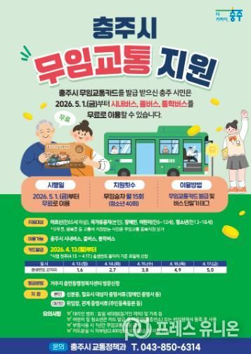 프레스유니온 김성길 기자 | 충주시가 교통약자의 이동 편의를 높이고 사회활동 참여를 독려하기 위해 오는 5월 1일부터 ‘충주시 어르신 등 무임교통 지원 사업’을 전격 시행한다고 밝혔다.