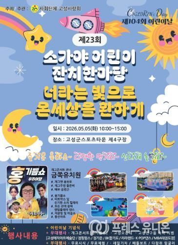 프레스유니온 강찬희 기자 | 고성군은 제104회 어린이날을 맞아 ‘너라는 빛으로 온 세상을 환하게’를 슬로건으로, 오는 5월 5일 오전 10시 스포츠타운 4구장에서 ‘제104회 어린이날 행사 및 제23회 소가야어린이 잔치 한마당’을 개최한다고 밝혔다.