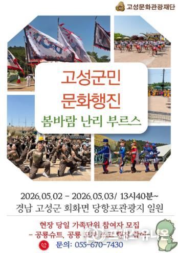 오는 5월 2일과 3일 오후 1시 40분부터 경남 고성군 회화면 당항포관광지 일원에서 군민 참여형 퍼레이드 ‘고성군민 문화행진–봄바람 난리 부르스’를 개최한다고 밝혔다.
