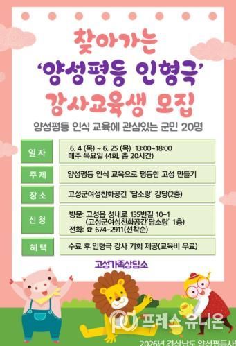 프레스유니온 강찬희 기자 | 고성가족상담소는 지역사회 내 성평등 문화 확산과 폭력 예방을 위한 ‘찾아가는 양성평등 인형극 강사 교육생’을 모집한다.