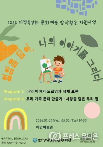 프레스유니온 강찬희 기자 | (재)영암문화관광재단은 오는 5월 1일과 5월 5일 오후 2시, 이안미술관에서 ‘영암을 담아, 나의 이야기를 그리다’라는 주제로 문화예술 교육 프로그램을 진행한다.