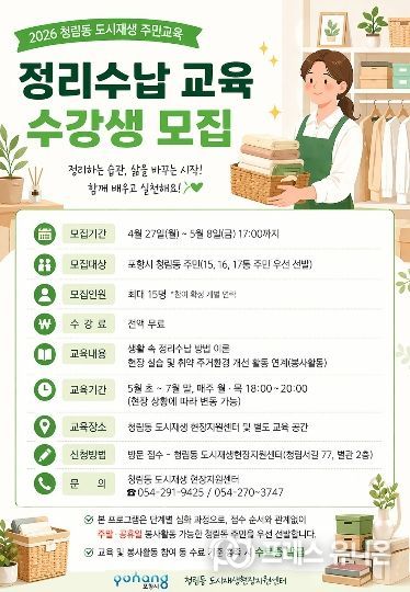 프레스유니온 강찬희 기자 | 포항시 도시재생과는 청림동의 주거 환경을 개선하고 주민 스스로 마을을 돌볼 수 있는 자생력을 키우기 위해 ‘2026 청림동 도시재생 주민교육 : 정리수납 교육 및 집수리 교육’ 참여 주민을 모집한다.