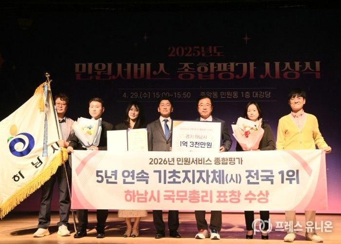 프레스유니온 김성길 기자 | 하남시가 전국 기초자치단체 중 최고 수준의 민원서비스 역량을 인정받으며 5년 연속 최우수 기관으로 선정됐다. 하남시는 29일 정부세종청사에서 열린 ‘2025년 민원서비스 종합평가’ 우수기관 시상식에서 국무총리 표창을 수상했다고 밝혔다.