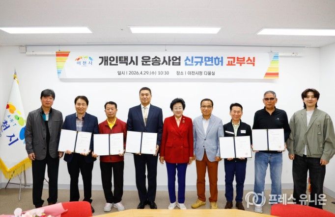 프레스유니온 김성길 기자 | 이천시는 29일 시청 다올실에서 개인택시운송사업 신규 면허증 교부식을 개최하고, 심사를 통해 최종 선정된 5명의 대상자에게 면허증을 전달했다고 밝혔다.