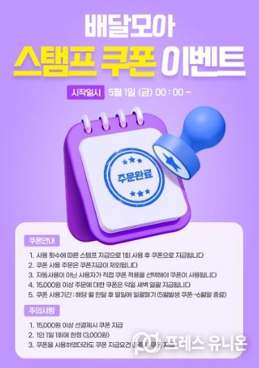 프레스유니온 강찬희 기자 | 제천시는 공공배달앱 ‘배달모아’ 이용 고객을 대상으로 5월 1일부터 ‘스탬프 쿠폰 이벤트’를 진행한다.