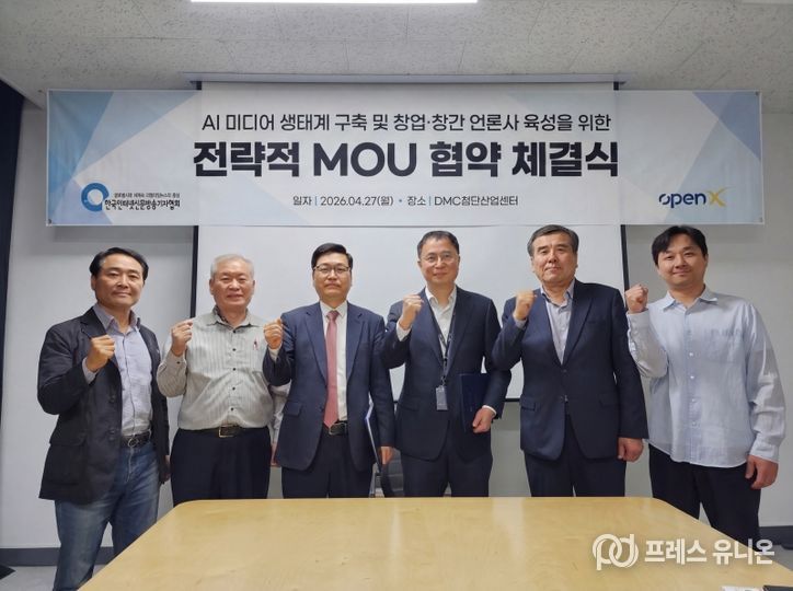 프레스유니온 강찬희 기자 | 한국인터넷신문방송기자협회(회장 전병길, 이하 협회)와 오픈엑스(대표 김미진)는 지난 2026년 4월 27일 서울 상암동 DMC첨단산업센터에서 업무협약(MOU)을 체결하고, 제휴 언론사 육성과 건강한 미디어 생태계 강화를 위해 적극 협력하기로 뜻을 모았다.