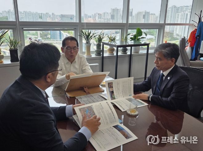 이날 건의한 주요 사업은 ▲고수 평촌 자연재해위험개선지구 정비(290억원), ▲대산 산정지구 풍수해생활권 종합정비(308억원) ▲아산 상갑지구 가뭄자연재해위험개선지구 정비(126억원) 등 총 3개 사업이다.