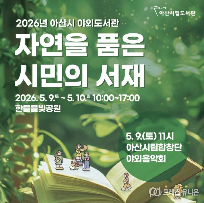 프레스유니온 강찬희 기자 | 아산시립도서관은 오는 5월 9일부터 10일까지 한들물빛공원 일원에서 야외도서관 '자연을 담은 시민의 서재'를 운영한다.