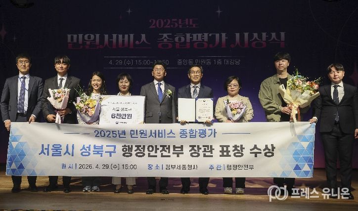 프레스유니온 강찬희 기자 | 서울 성북구가 행정안전부와 국민권익위원회가 공동 주관한 ‘2025년 민원서비스 종합평가’에서 행정안전부 장관 표창을 수상하며 민원행정 우수 지자체로서의 위상을 다시 한 번 확인했다.
