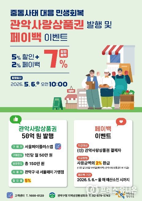 프레스유니온 강찬희 기자 | 관악구가 최근 중동 사태 여파로 인한 고유가·고물가로 위축된 소비 심리 회복을 도모하고자 ‘관악사랑상품권’을 추가 발행해 민생 경제에 훈풍을 불어넣는다.