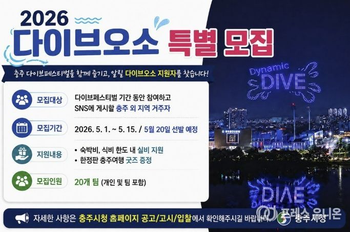 프레스유니온 김성길 기자 | 충주시가 ‘2026 충주 다이브 페스티벌 with MyK FESTA’을 맞아 지역 관광의 매력을 널리 알릴 특별 홍보단 ‘다이브 오소(O-SO) 충주’ 참여자를 모집한다고 밝혔다.