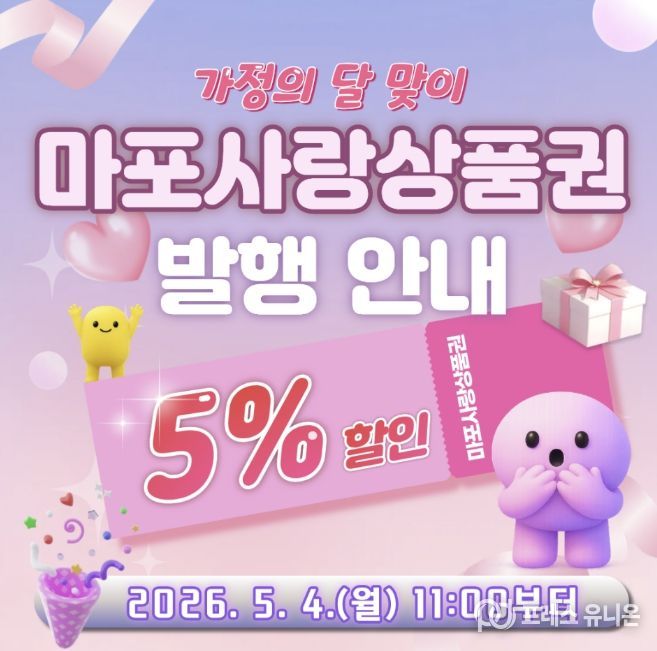 프레스유니온 강찬희 기자 | 마포구는 5월 가정의 달을 맞아 구민의 생활비 부담을 덜고 지역경제 활성화를 위해 100억 원 규모의 ‘마포사랑상품권’을 발행한다.