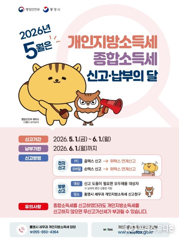 프레스유니온 강찬희 기자 | 통영시는 5월 개인지방소득세 및 종합소득세 신고·납부의 달을 맞아 2025년도에 종합소득이 있는 개인은 오는 6월 1일(월)까지 개인지방소득세와 종합소득세를 신고·납부해야 한다고 밝혔다.