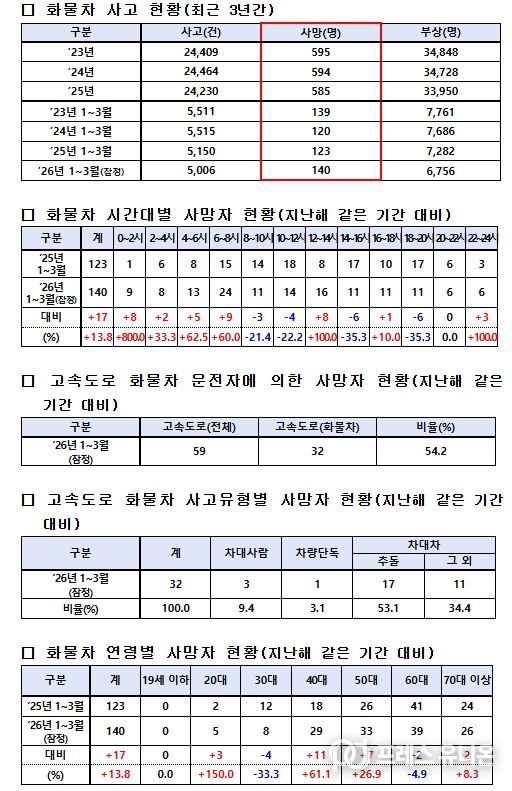 경찰청 교통사고 통계에 따르면 2026년 3월까지 발생한 화물차 사망사고(잠정)는 최근 3년 같은 기간 평균(1~3월) 발생한 사망자인 127.3명보다 9.9% 증가한 수준인 140명이 발생했다.