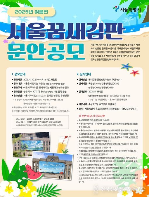 전국신문언론노동조합 강찬희 기자 | 서울시가 여름을 앞두고 ‘여름의 무더위를 잊게 해주는 시원하고 산뜻한 글귀’를 주제로 한 ‘서울꿈새김판 문안 공모’를 4월 30일부터 5월 12일까지 13일간 진행한다. 서울시 누리집을 통한 온라인 신청과 우편 신청으로 참여할 수 있다.