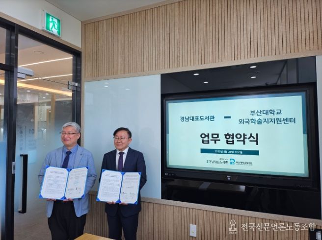 전국신문언론노동조합 강찬희 기자 | 경남대표도서관(관장 신민철)은 28일 오후 2시 부산대학교 도서관에서 부산대학교 외국학술지원센터(FRIC)와 우주항공·방산·원자력 관련 외국학술지 자원공유 및 도서관 서비스 확대를 위한 업무협약을 맺었다고 밝혔다.