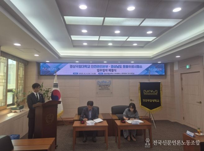 전국신문언론노동조합 강찬희 기자 | 경상남도 동물위생시험소는 4일 오후 2시 경상국립대학교에서 연구 종사자 안전 역량 강화 및 연구실 안전관리 문화 확산을 위해 경상국립대학교 안전관리본부(본부장 고필옥)와 업무협약을 체결했다고 밝혔다.