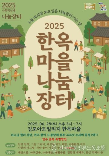 전국신문언론노동조합 기자 | 김포시는 6월 28일 오후 3시부터 7시까지 김포한옥마을에서 시민들과 함께하는 ‘사회적경제 나눔장터’를 개최한다. 당초 오후 1시에 시작될 예정이었으나, 한낮 더위를 고려해 오후 3시로 조정하여 시민들이 편안하게 참여할 수 있도록 했다.
