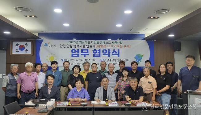전국신문언론노동조합 기자 | 영중38선이야기마을공동체는 지난 24일 포천시 영중면 행정복지센터에서 영중면 이장협의회와 마을 내 태양광 엘이디 가로등 설치를 위한 업무협약을 체결했다.