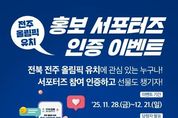 전국신문언론노동조합 김성길 기자 | 전북특별자치도는 전주 하계올림픽 유치를 향한 국민적 관심과 응원을 모으기 위해 다음 달 21일까지 '전주 올림픽 유치 홍보 서포터즈 인증 이벤트'를 진행한다고 1일 밝혔다. 도는 국민과 함께 만들어가는 전주 올림픽 유치를 목표로 지난 8월부터 홍보 서포터즈를 모집·운영 중이다. 약 1,900명이 참여하고 있는 서포터즈는 개인 SNS 등 온라인 채널을 통해 전주 올림픽 유치 소식을 자유롭게 공유하며, 올림픽 개최의 필요성과 의미를 국민에게 널리 전파하는 역할을 담당하고 있다. 이번 인증 이벤트는 서포터즈 가입 후 발급받은 위촉장을 개인 SNS에 지정 해시태그(#전북전주올림픽, #홍보서포터즈, #올림픽유치응원)와 함께 게시하고, 새로 제작된 전주 올림픽 유치 홍보 영상에 '좋아요'와 응원 댓글을 남긴 뒤, 네이버 폼으로 참여 신청을 마치면 된다. 참가자 중 무작위 추첨으로 커피 기프티콘(2만원권 100명, 1만원권 200명) 등 총 300명에게 경품을 증정한다. 또한 서포터즈 활동 실적을 종합 평가해 우수 활동자를 선발하고, 오는 12월 말 전북특별자치도지사 표창과