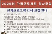 전국신문언론노동조합 기자 | 가평군도서관은 2026년 도서관 문화프로그램을 운영할 강사를 공개 모집한다고 11일 밝혔다. 모집 대상은 가평군도서관 문화프로그램 운영을 희망하는 강사로 거주지 제한은 없으나 가평군 거주자 또는 인근 지역의 강사를 우선 모집한다. 모집 분야는 유아부터 성인을 대상으로 하는 독서문화 프로그램을 비롯해 취미, 교양, 체험 등 도서관에서 운영 가능한 분야이다. 모집 기간은 올해 12월부터 상시 모집하고 있으며 제출서류를 준비해 가평군 도서관 4개소(한석봉, 설악, 청평, 조종)에 방문 또는 가평군도서관 홈페이지 공지사항에 기재된 이메일로 제출하면 된다. 제출된 서류는 가평군도서관 강사인력풀에 등록 및 관리되며, 추후 도서관 문화 프로그램 운영을 위한 강사로 활동할 수 있다. 기타 자세한 내용은 가평군도서관 홈페이지 공지사항을 참고하거나 가평군도서관으로 문의하면 안내받을 수 있다. 도서관 관계자는 “이번 공개 모집을 통해 유능하고 열정 있는 강사를 모집해 지역 주민에게 다양하고 유익한 프로그램이 운영될 수 있도록 최선의 노력을 하겠다”고 밝혔다.