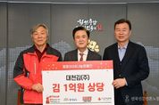 전국신문언론노동조합 강찬희 기자 | 충남도는 대천김으로부터 1억원 상당의 김을 기탁받았다고 27일 밝혔다. 이날 도지사 외부접견실에서 열린 전달식에는 김태흠 지사를 비롯해 최민순 대천김 총괄대표, 성우종 충남사회복지공동모금회장 등이 참석해 나눔의 의미를 함께했다. 이번에 기탁된 김은 충남사회복지공동모금회를 통해 경제적 어려움을 겪고 있는 이웃들에게 전달될 예정이다. 김 지사는 “지역 기업의 따뜻한 나눔이 취약계층에게 큰 위로와 도움이 될 것”이라며 “기탁된 물품을 꼭 필요한 분들께 전달하겠다”고 말했다. 최민순 총괄대표는 “지역사회와 함께 성장해온 기업으로서 어려운 이웃에게 조금이나마 보탬이 되고자 했다”며 “앞으로도 지속적인 나눔을 통해 사회적 책임을 다하겠다”고 답했다.