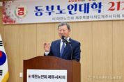 전국신문언론노동조합 강찬희 기자 | 김완근 제주시장은 2월 11일 조천주민교류센터 회의실에서 열린 제21기 동부노인대학 졸업식에 참석해 축하 인사를 전했다. 이번 졸업식은 졸업생 32명과 내빈 등이 참석한 가운데 학사보고, 졸업증서 수여, 표창 수여, 축사 등의 순서로 진행됐다. 제주시 동부노인대학은 2년 과정의 교육프로그램으로, 어르신들의 삶의 질을 높이고 건강한 노후 생활을 지원하기 위해 운영되고 있다. 프로그램은 매주 화요일과 수요일 2시간씩 진행되며, 노인 교양, 건강관리, 정치·사회·시사 상식, 문화 체험 활동 등 다양한 내용으로 구성돼 있다. 김완근 제주시장은 “노인대학을 졸업하신 여러분께 진심으로 축하의 말씀을 드리고, 나이를 뛰어넘는 여러분의 열정과 도전은 우리 모두에게 큰 울림을 주고 있다”며, “병오년 새해 배움의 기쁨이 여러분의 삶의 버팀목이자 활력이 되어 언제나 건강하고 행복한 나날을 이어가시길 바란다”고 말했다.
