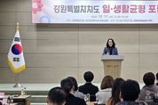 전국신문언론노동조합 강찬희 기자 | 강원특별자치도는 12월 17일 강원특별자치도와 강원특별자치도경제진흥원이 공동 주최하고, 강원특별자치도여성가족연구원과 강원여성새로일하기센터가 주관하여 강원특별자치도여성가족연구원 1층 강당에서 '강원특별자치도 일·생활균형 포럼'을 개최했다. 이번 포럼은 여성의 경력단절을 예방하고, 저출산 및 지역소멸 극복을 위해 지역사회 전반에 일·생활 균형 문화를 확산하기 위한 담론장으로 마련됐다. 포럼에서는 '강원특별자치도 일·생활균형 실태조사' 결과를 공유하고, 행정·기업·노동·지역 현장 등 다양한 주체가 참여한 토론을 통해 강원지역의 여건을 반영한 정책 방향과 실행 과제가 논의됐다. 좌장은 정구연 교수가 맡았다. 토론에는 박관희 강원특별자치도의원, 이지영 강원교통방송 편성국장, 남미영 한국여성경제인협회 강원지회 명예회장, 김재중 한국노동조합총연맹 강원도지역본부 의장, 박옥희 엔씨스마트컨설팅 대표(가족친화인증 평가위원), 윤수경 강원광역여성새로일하기센터 센터장, 유효숙 강원특별자치도 여성청소년가족과 팀장이 참여해 분야별 현장 경험과 제도 개선 의견을 공유했다. 정영미 강원특별자