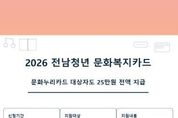 전국신문언론노동조합 김성길 기자 | 전라남도는 2026년부터 전남 청년 문화복지카드 사업 추진 시 경제적 취약 계층(기초생활수급자·차상위계층)이 수혜를 받는 문화누리카드 지급자에게도 25만 원 전액을 지급한다고 밝혔다. 전남청년 문화복지카드는 청년의 문화 향유 기회를 넓히고 자기 계발을 돕기 위해 2022년부터 시행하고 있다. 전국 최초로 소득 기준 없이 청년에게 문화복지비를 10년간 최대 250만 원을 지원한다. 이를 통해 청년은 공연 관람, 학원 수강, 도서 구입, 체육시설 이용 등 다양한 문화·복지 혜택을 받을 수 있다. 기존 전남청년 문화복지카드는 전남에서 2년 이상 주소를 두고 거주한 19세 이상 28세 이하 청년에게, 1인당 연 25만 원을 지원했지만, 문화누리카드 수혜를 받는 신청자에 한해서는 문화누리카드 수혜액을 차감한 금액만 지급했다. 전남도는 취약계층 청년의 실질 지원액이 줄어 형평성 문제를 해결하기 위해 보건복지부 사회보장협의 개선 건의를 통해 복지 불균형을 해소하고 청년의 문화향유권을 보장하기 위해 제도 개선을 추진했다. 이후 1년여 노력 끝에 결실을